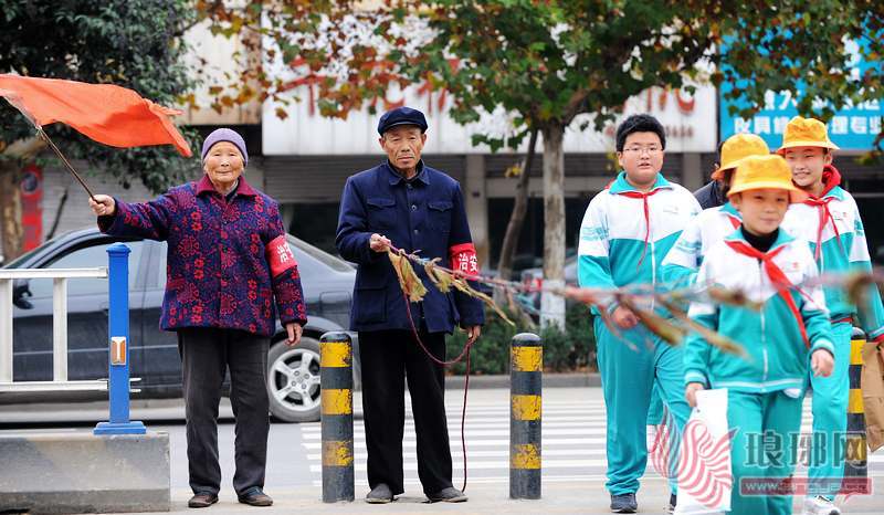 在老人的护送下,孩子们安全的穿过马路。