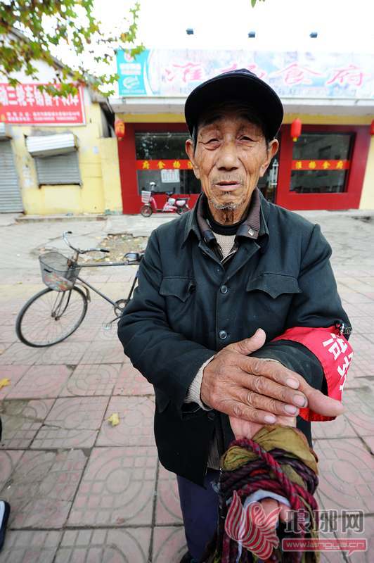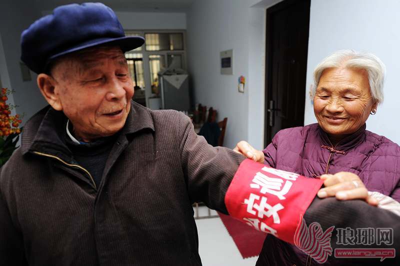老伴为侯西义带上红袖标。