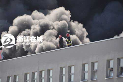 从灵杰发回的图片可以看到,仓库区火势较大,仓库顶部浓烟滚滚,由于是堆放鞋帽服装等商品,燃烧产生大量有毒烟雾。