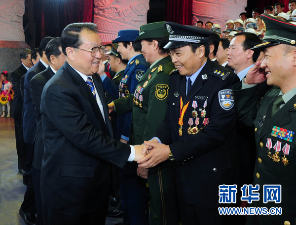 5月11日,《中国奇迹——纪念抗击汶川特大地震三周年大型专题文艺晚会》在京举行,中共中央政治局常委李长春出席观看。这是晚会结束后,李长春与抗震救灾英模代表亲切握手。新华社记者张铎摄