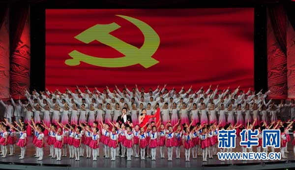 5月11日,歌手魏松、王莉在领唱歌曲《在灿烂阳光下》。 当日,《中国奇迹——纪念抗击汶川特大地震三周年大型专题文艺晚会》在北京举行。新华社记者张铎摄