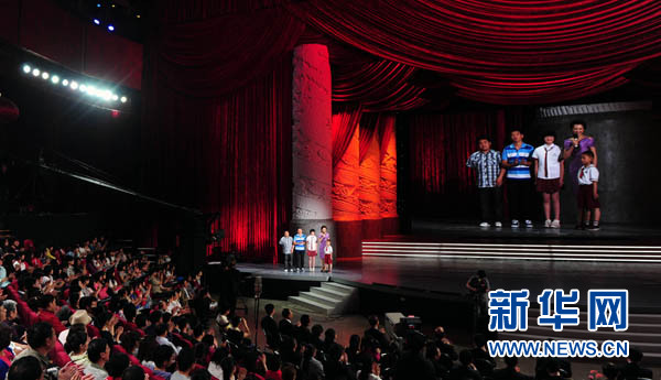 5月11日,主持人董卿与郎铮、李阳、薛枭、唐沁现场交流。 当日,《中国奇迹——纪念抗击汶川特大地震三周年大型专题文艺晚会》在北京举行。新华社记者张铎摄