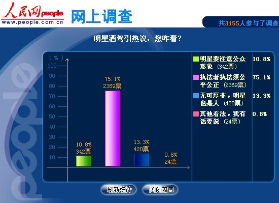 截至11日23时,共有3155人次参与了调查。10.8%的网友(3028票)认为“明星要注意公众形象”;另有75.1%的网友(2369票)表示“执法者执法须公平公正”;最后13.3%的网友(420票)称“无可厚非,明星也是人”。此外,还有0.8%的网友(24票)选择“其他,我有话要说”。