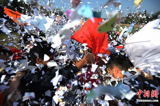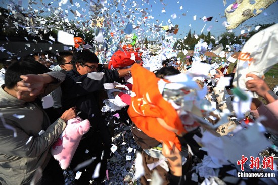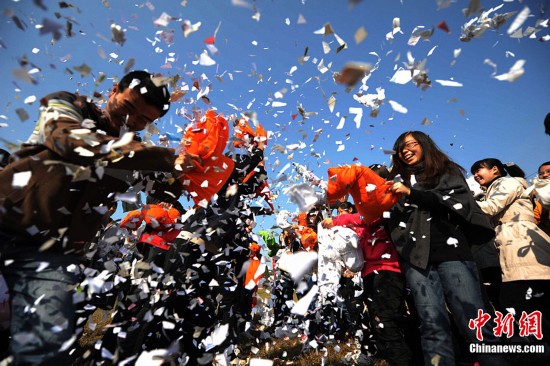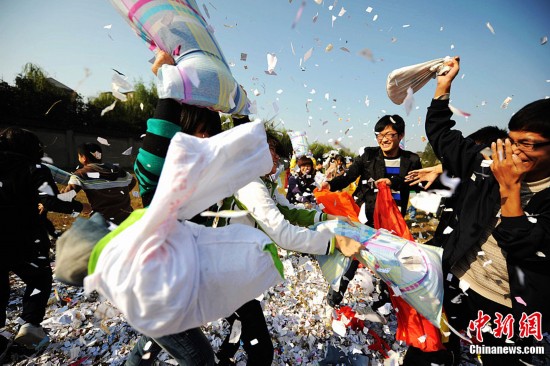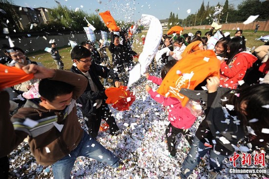 11月10日,随着2011年11月11日世纪光棍节的临近,江苏扬州大学医学院的“90后”光棍大学生们通过利用废纸和废旧衣服别出心裁的自制了“废纸枕头”,以“枕头大战”的这样一种特殊方式释放紧张学习压力,欢度“世纪光棍节”。图为11月10日,90后大学生们用“废纸枕头”展开对决,欢度光棍节。