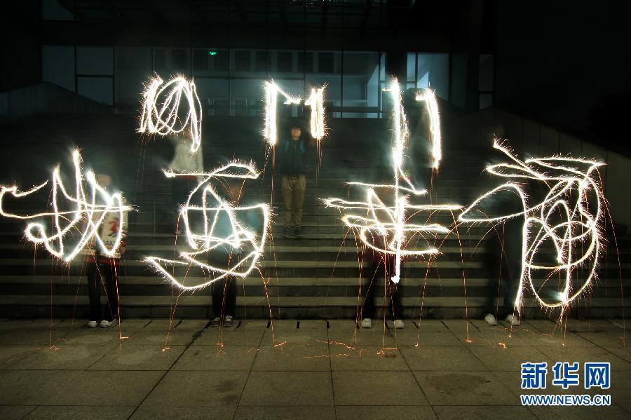 11月10日晚,江苏省淮阴师范学院的大学生用烟花棒在空中画出“11 11 11 我要幸福”的字样,迎接2011年11月11日“世纪光棍节”。