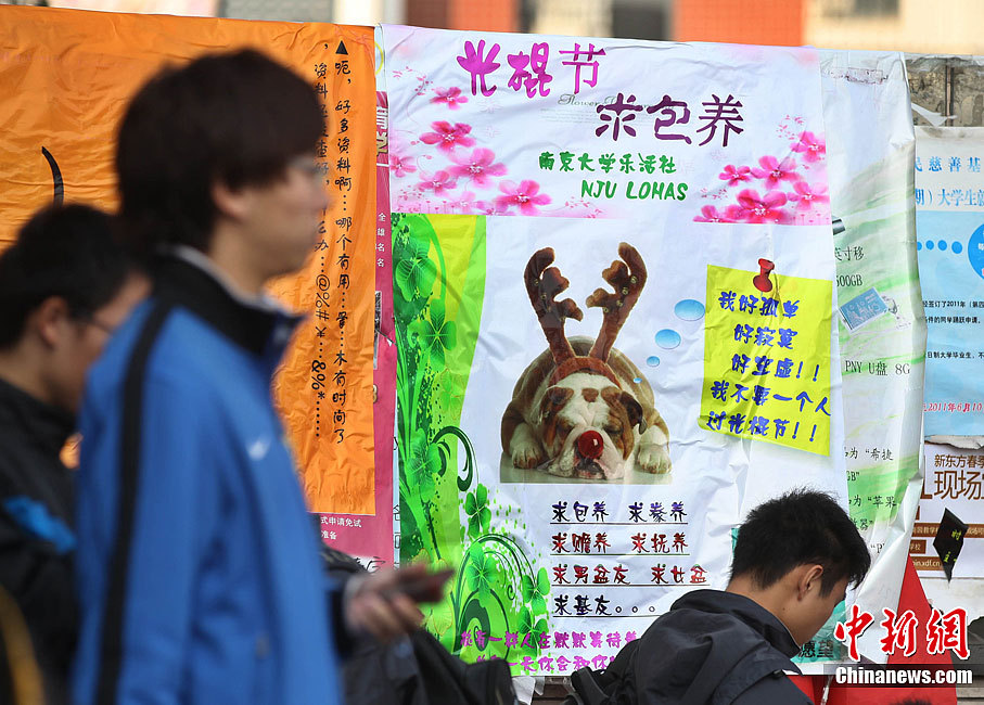 11月10日,写着“光棍节,求包养”的海报出现在南京一所高校校园内,吸引了不少眼球。