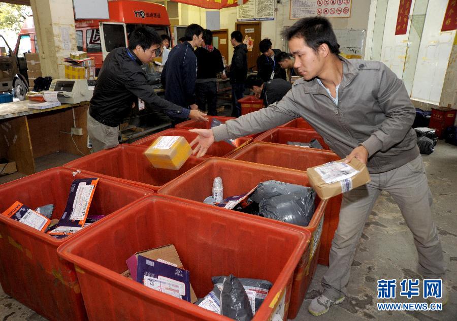 11月10日,备战“双十一”的上海某快递公司工作人员在浦西分拣站分拣快递包裹。近日,全国9家快递企业急调约4万名快递员、超过700辆快递车,备战11月11日“光棍节”期间的网购热潮。今年的“光棍节”恰逢2011年11月11日,被称为“世纪光棍节”,众网商纷纷推出“给力”的促销手段,点燃节日期间的网购“狂欢”。