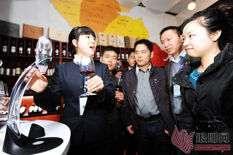 在酒水酒文化展区内,工作人员向客商演示红酒醒酒的方法。