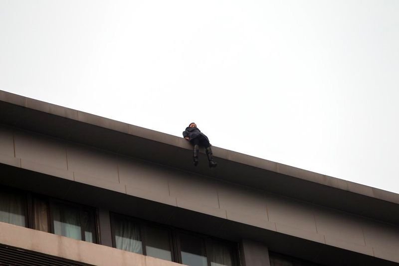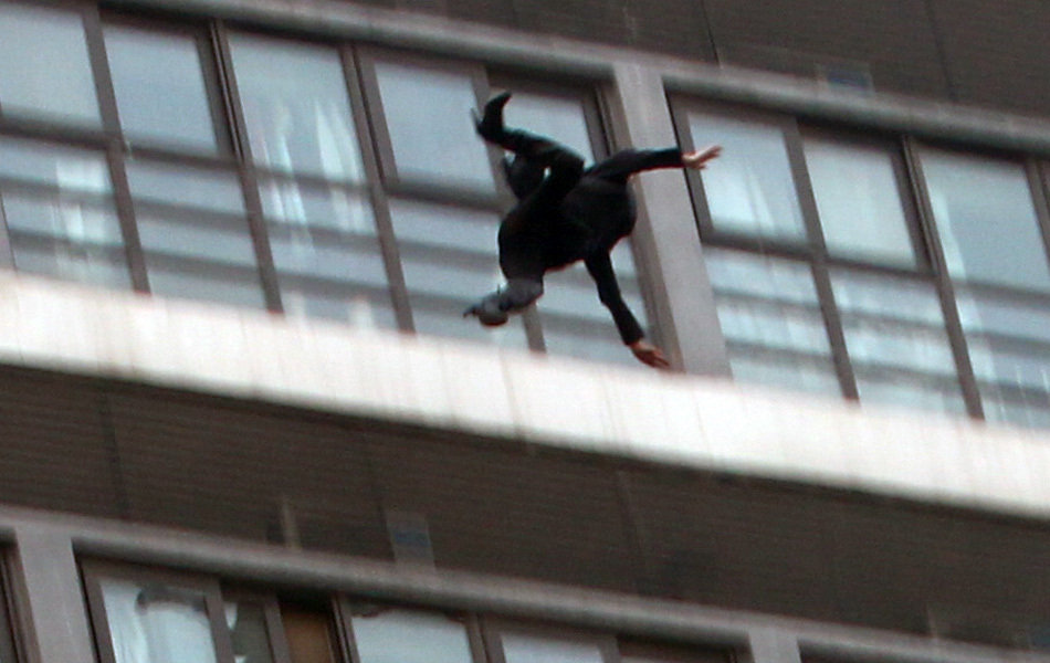 现场没有看到有消防人员撑起安全气垫。现场一个人说,可能是楼层太高,安全气垫起不了多大作用。下午5时9分,她身子向后仰去,腿也向下伸直,两个手臂撑紧。几秒钟后,她在空中转了几个圈落到了地面。图/东方IC