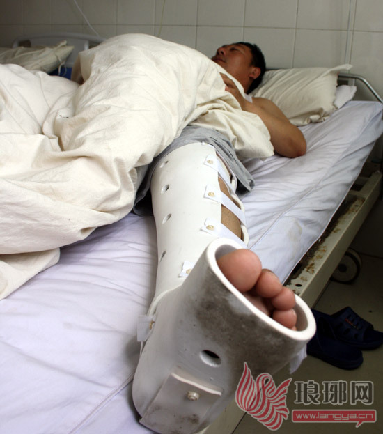 12日上午,在平邑县中医医院病房,记者见到了住院的张文信。此时张文信左小腿用石膏固定,正躺在病床上。