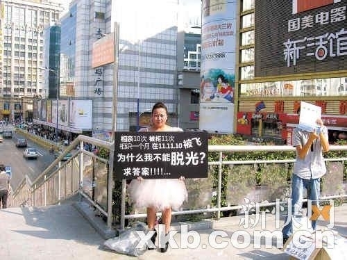 昨日14时许,记者发现在岗顶BRT天桥众人正在围观一位女子。记者遂上前打探,发现被围观的女孩身着一袭公主白衣裙,背后还长着一双天使翅膀。就在众人感到疑惑时,女孩将手中的纸牌缓缓举起。记者定睛一看,发现上面写着“相亲10次被拒11次,相识1个月,在2011年11月10日被飞,为什么我不能脱光?求答案!!!”此牌一出,立即让围观的众人轰然大笑。不少市民举起手机拍照,表示要现场发微博。