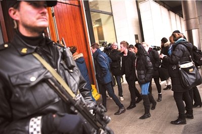 布雷维克当天穿白衬衫,着深色西服,系浅蓝色领带,在警察护卫下进入挪威首都奥斯陆一家法庭。