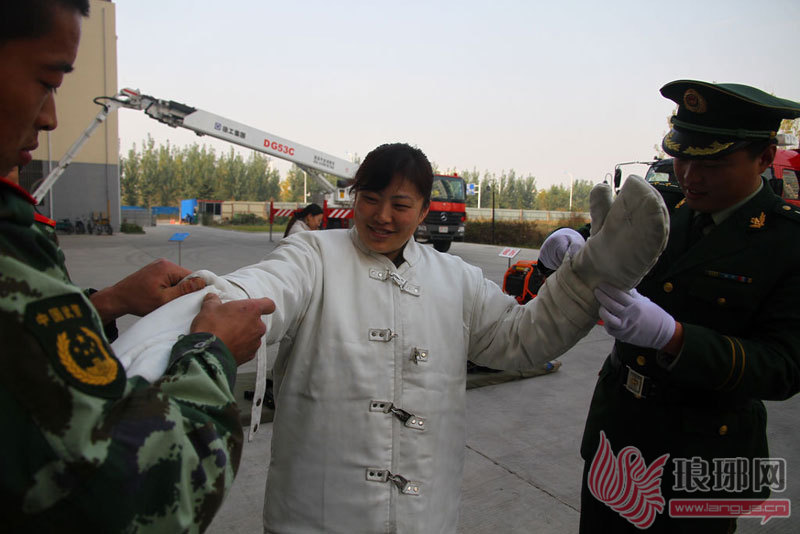 记者体验消防服。