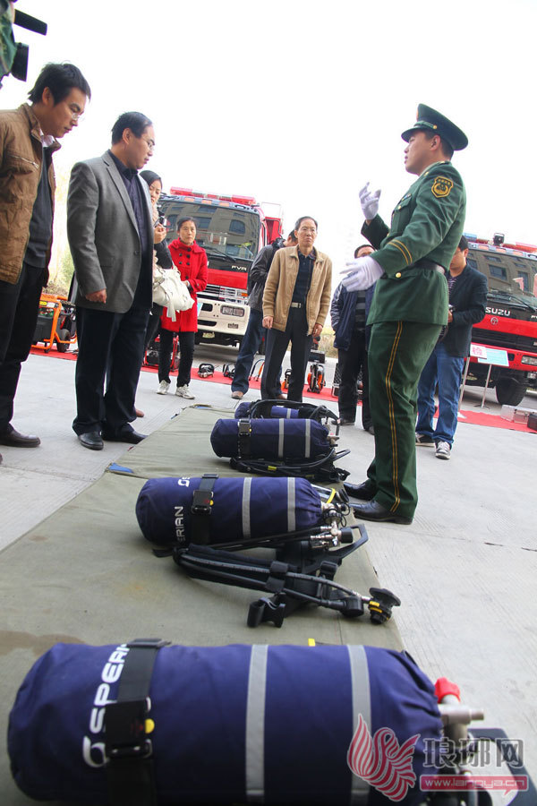 消防官兵介绍空呼器。