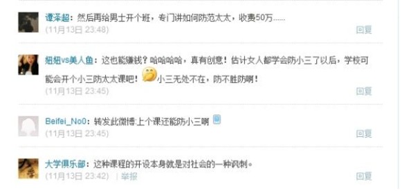 网友们认为,婚姻出现问题不是靠几节课就能挽回的,“小三能介入夫妻俩的生活中,其实质是夫妻俩的感情生活出了问题,夫妻俩要各自反省自己,为建立一个美丽和睦的家庭而反省。小三问题不在于防,而是要修复夫妻俩的感情!”网友“盲眼看世间”写道。