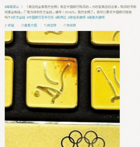 健力宝“假金罐”事件后,有关千足金真假的话题持续发酵。14日中午,网友“海南梁山”的一条微博引起网民关注:“4年前买的限量版号称奥运纯金纪念章,竟然生锈了。”