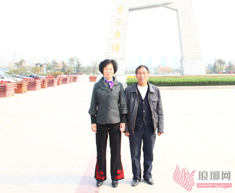 赵作海和妻子李素兰在临沂市书法广场合影留念。