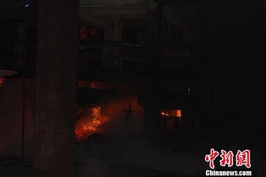 16日晚9时50分左右,江西省萍乡钢铁厂一炼铁高炉发生铁水泄漏事故,泄漏铁水遇水发生爆炸,造成周围可燃物质瞬间燃烧。 杨仁志 摄