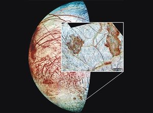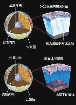 木卫二卫星比月球稍小。“伽利略”号发回的数据显示,其表面布满裂纹和杂乱的冰,表面以下埋藏着大量含盐液态水,这一阳光罕至的星球如何形成如此奇怪的形态令研究人员感到惊奇。他们构建的模型显示,木卫二外层的冰厚约10千米,但冰层内部可能存在分布深度达3千米的液态水。这些温暖的埋藏水向上喷发,导致木卫二表面的冰变得易碎并最终裂开。这种冰水之间的转换有可能在天体表面和埋藏水之间传递能量和营养物,从而为生命存在提供条件。