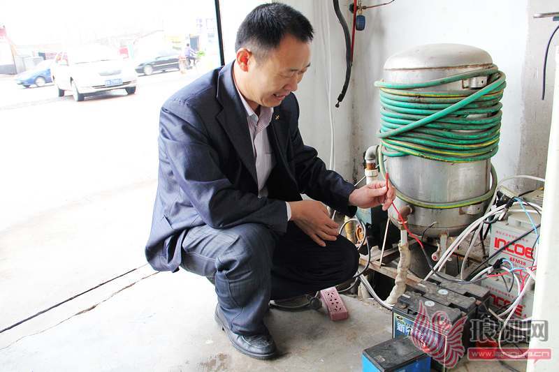 高洪云向记者演示用太阳能充过电的蓄电池给灯管送电。