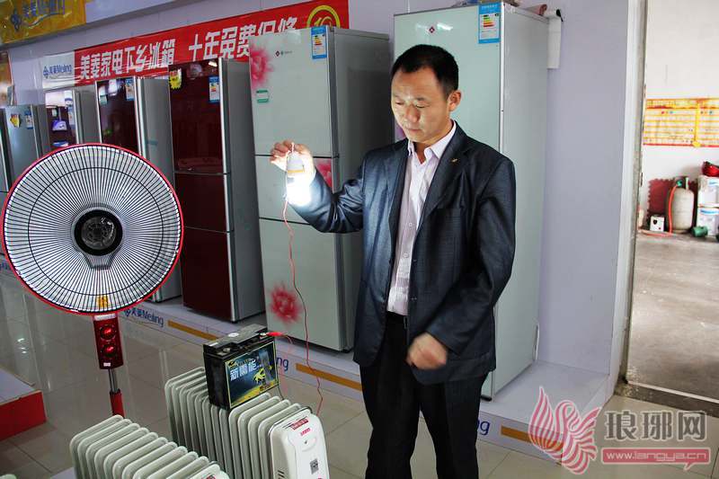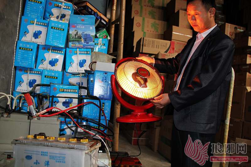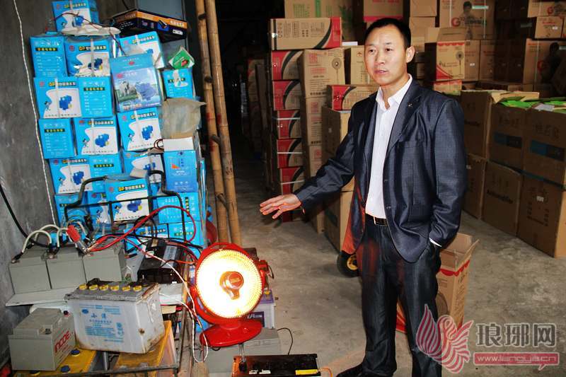 高洪云向记者演示用太阳能充过电的蓄电池给小电器送电。