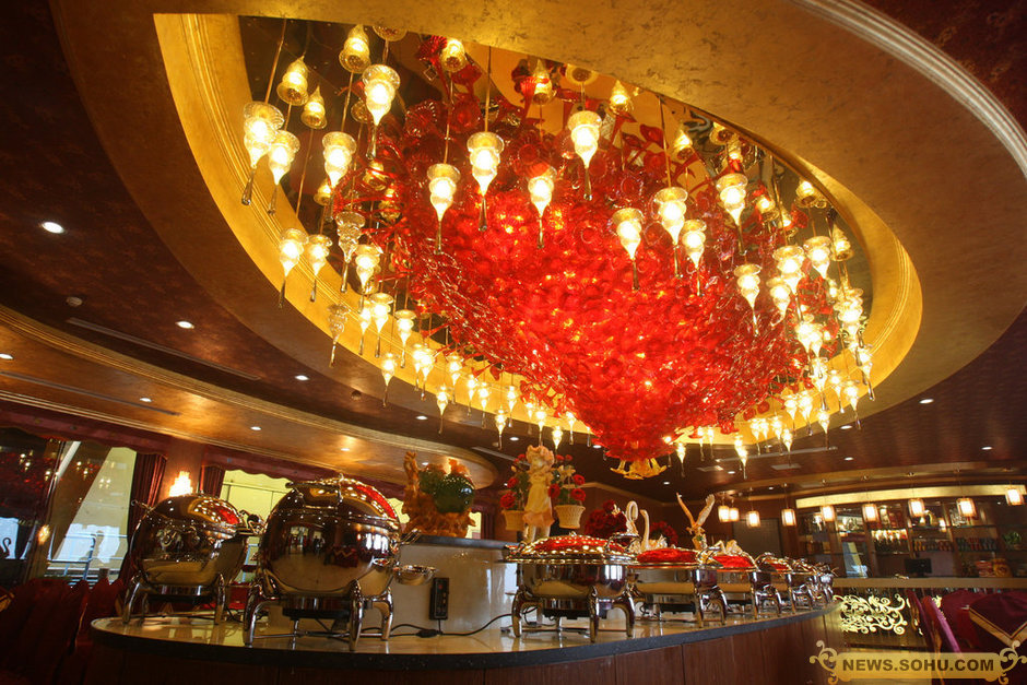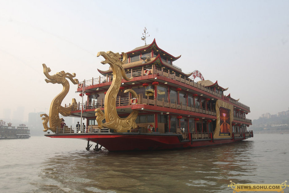这艘游船以金色和红色为主色调,两条巨大的龙和凤峭立船首,船顶为中国3个古代宫廷楼阁建筑风格,船身两边的4层楼为若干红柱和数十个大红灯笼装饰。入夜后,在游船灯饰的照射下,犹如一座金光灿灿的皇宫漂浮在江面上。