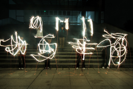 11月10日晚,江苏省淮阴师范学院的大学生用烟花棒在空中画出“11 11 11 我要幸福”的字样,迎接“世纪光棍节”。