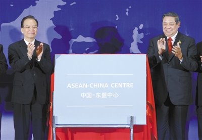 昨日,国务院总理温家宝与东盟国家领导人共同在印尼巴厘岛出席中国-东盟中心揭牌仪式。右为印度尼西亚总统苏西洛。据介绍,中国-东盟中心总部设在北京,今后将陆续在东盟各成员国和中国其他省市设立分中心。新华社记者王晔 摄
