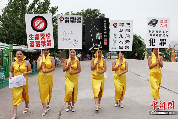 5月12日,重庆洋人街成立一支“女子禁酒队”,专门劝诫司机不要酒驾。据悉,今后每逢周末、节假日,美女们都要举着“禁酒标语”上街发禁酒传单,并会让司机签名拒酒驾。图为“女子禁酒队”举着醒目的“禁酒标语”走在马路上。中新社发刘函冉摄
