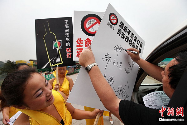 5月12日,重庆洋人街成立一支“女子禁酒队”,专门劝诫司机不要酒驾。据悉,今后每逢周末、节假日,美女们都要举着“禁酒标语”上街发禁酒传单,并会让司机签名拒酒驾。图为一名过路司机在收到一份禁酒驾宣传单后,签名支持不酒驾。中新社发刘函冉摄