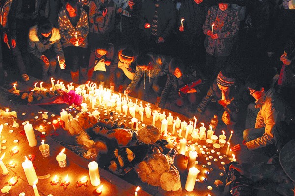 17日晚,兰州网友自发前往兰州东方红广场,为甘肃庆阳正宁县校车事故遇难的幼儿祈福。