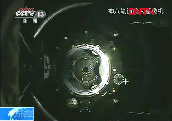 11月14日晚,天宫一号与神舟八号实现第二次交会对接。图为二次对接的视频截图。