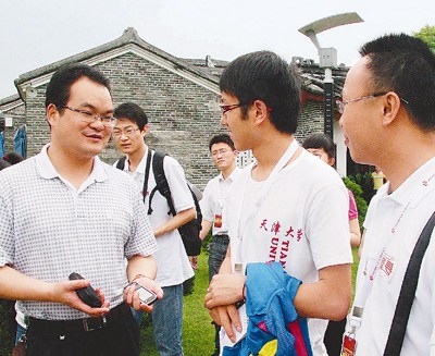 5月12日,古田会议纪念馆馆长傅柒生(左一)与同学们交谈。 徐林 摄