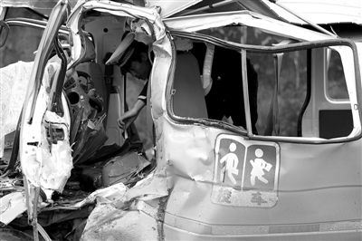 破碎的玻璃,沾着血的书包,扭曲的汽车零件,散落在地。校车毁了,车头烂成一团,卡进卡车的车底,撞击让校车车厢呈波浪形裂开。卡车的玻璃碎了,宽大的车轮下躺着四名从校车里弹出的娃娃。