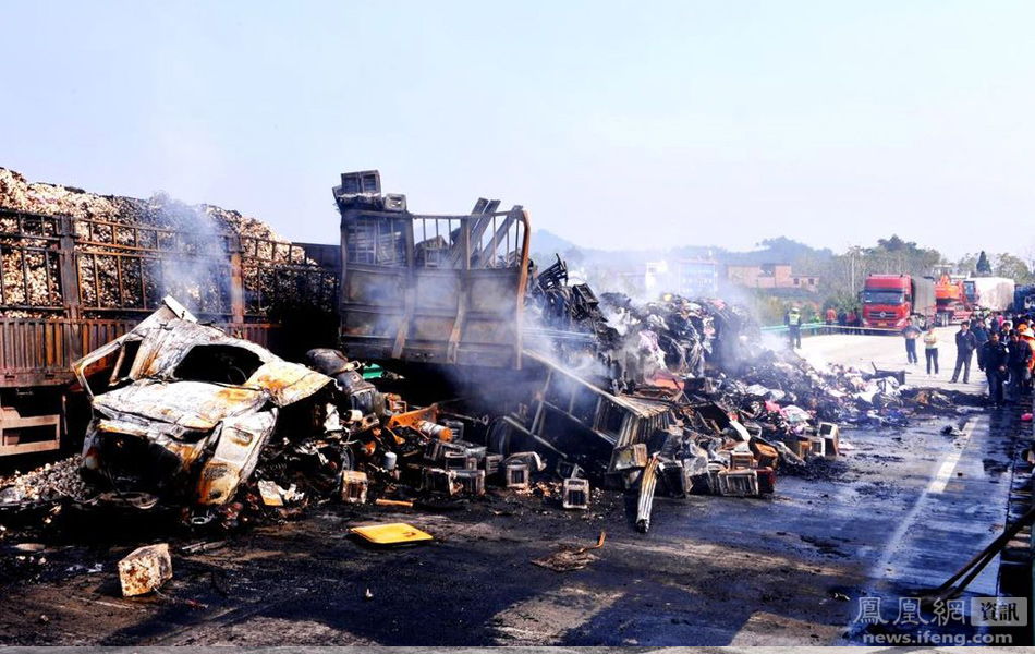 11月21日早晨6时40分左右,沪昆高速K1336公里处邵怀段(湖南洞口县境内)突起大雾,引发三辆大货车追尾相撞,货车事故引发的大火造成能见度的进一步降低,最终导致5人死亡,多人受伤,交通中断4个多小时。图为事故现场。