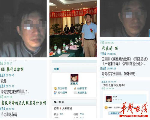 据《成都商报》11月22日报道 11月19日晚,多个论坛出现内容同样的帖子,资阳市雁江区地方志办公室职工王某被曝与一名自称“妹妹”的网友聊天,聊天内容中出现一些挑逗性语言,并有一张暴露隐私部位的视频截图。随后,该帖被新浪微博和部分论坛转发,引起众多网友关注和讨论。