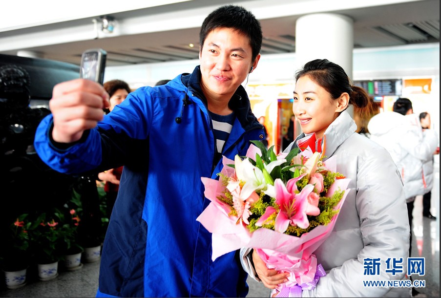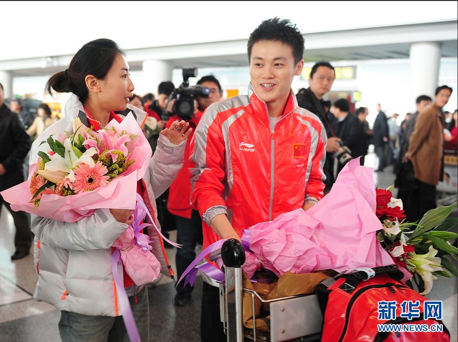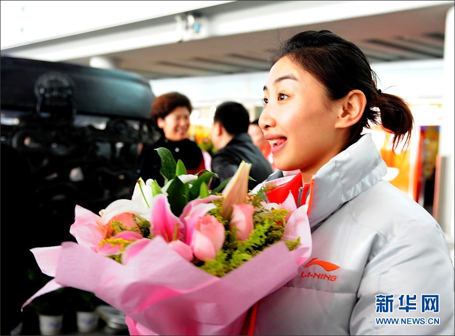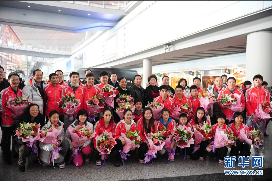 2011年11月22日,中国蹦床队抵达首都国际机场,何雯娜在女子网上个人项目中夺得自己的第一枚世锦赛金牌,中国蹦床队的伯明翰世锦赛征程画上圆满的句号。中国队不仅以8金3银1铜高居奖牌榜首位,同时还第三次包揽了奥运项目男、女网上个人两金,并拿到了满额4个伦敦奥运会席位。新华网 李欣 摄