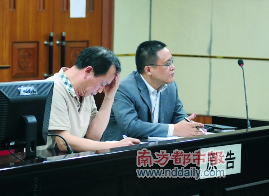 广州千万富翁“被精神病”一案于11月18日宣判,庭审中原告何锦荣(左)低头扶额。南都记者冯宙锋摄