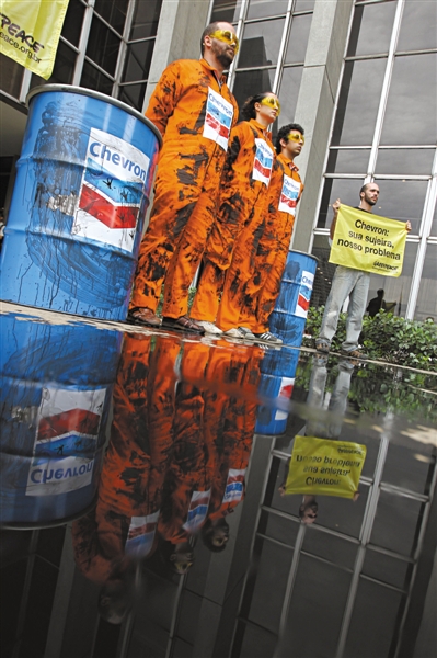 18日,环保组织在雪佛龙巴西里约热内卢总部门前抗议漏油污染海洋生态。