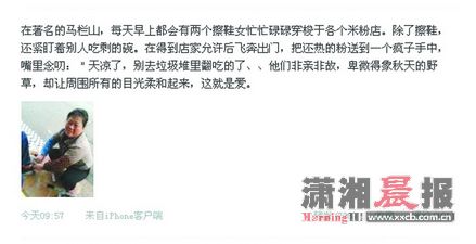 昨天上午9:57,湖南卫视主持人李锐更新了一条新浪微博,主角是两名在马栏山擦鞋的妇女:她们早上到各个米粉店为食客擦鞋,同时,把别人吃剩的、余温尚存的米粉送到一个流浪汉的手中。