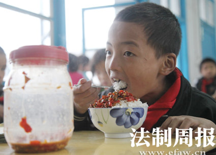 凤凰县山江镇完小四年级的吴彬每周带一罐辣椒酱,到周末正好吃完。让他兴奋的是今天是周五了,周末回家能吃到肉了。