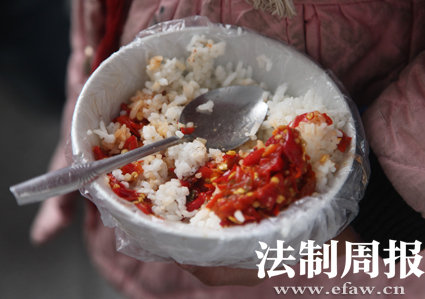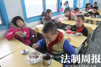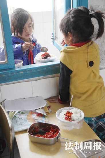 五年级学生吴送金的家离学校有近十公里。每周日,他从家里带一罐辣椒酱来学校,每餐弄几小勺,这样正好吃一周。每逢周末最让他高兴,因为回家有肉有青菜吃。二年级8岁的龙友却觉得吃辣椒酱挺好,学校里这么多人一起吃比家里有味些,在家里,只有外公外婆陪他,父母都在浙江打工。