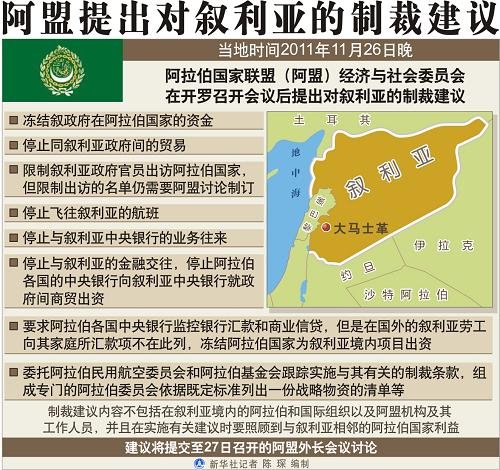 阿盟秘书长阿拉比在记者会上说,经济制裁包含了很多方面,目的在于停止叙利亚的流血冲突,也有国家提出下一步的政治制裁,包括召回大使以及断绝外交关系,但是,阿盟短期内没有这个计划。