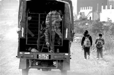 21日,安徽巢湖,站在三轮摩托车上的孩子。在巢湖市烔炀镇,一些三轮摩托车充当起了“校车”的角色,大部分超载严重,以致险象环生。马启兵 摄