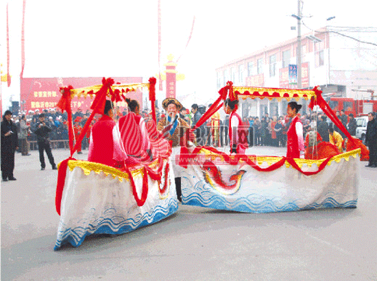 “已是阳春三月天,渔妇轻歌唱华年。锣鼓敲得麦场小,树头争看双旱船。”坊间流传的小诗《村戏》,道出了双旱船歌舞在郯城受欢迎的程度。