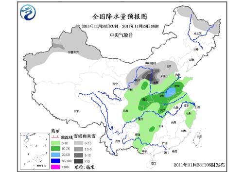 今日,中东部雨雪的范围有显著扩大,中央气象台预报,新疆西部和北部、黑龙江北部、内蒙古中部、华北中北部有小到中雪或雨夹雪;西北地区东部、华北南部、黄淮、江淮大部、江汉、西南地区东北部、江南西部和东部、华南西部等地有小到中雨,其中河南东北部、山东西南部等地的部分地区有大雨(25~35毫米)。