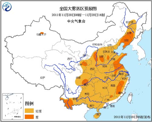 今日(28日),雨雪和大雾是我国中东部地区天气的主旋律。雨雪方面,从华北黄淮一直到江南华南的部分地区都将出现不同程度的降雨(雪)天气。而盘踞我国中东部多日的大雾今日继续发威,今晨至上午,雾霾天气统治的范围将从东北一直蔓延到西南地区。此外,受冷空气影响,目前,降温区主要位于内蒙古、东北一带。