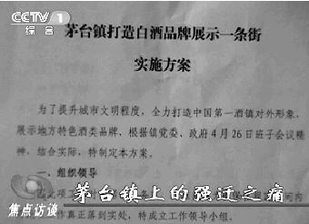 茅台镇是一个以造酒闻名的古镇,近年来,又发展起了一批生产白酒的企业。为了打造“中国第一酒镇”的品牌,促进旅游业和造酒业的发展,茅台镇政府决定,把环茅南路建成“白酒品牌展示一条街”,并要求街上所有商铺都必须卖当地产的白酒,不卖酒的商铺则要立即搬走。4月26日,茅台镇政府派出工作人员到各家商铺了解情况。而商户们没想到,5月1日镇政府就正式下发了搬迁通知,要求5月3日完成搬迁。也就是说,商户从接到通知到迁出此地,只有短短两天时间。