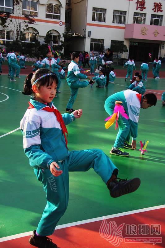 临沂二小的小学生在参加踢毽子比赛。