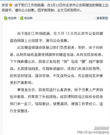 人民网北京5月16日电 (记者 申亚欣)今日上午,故宫通过官方微博承认由于工作疏漏,在5月13日向北京市公安局赠送的锦旗上出现错字,并向公众致歉,全文如下: